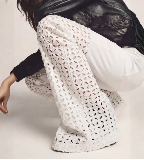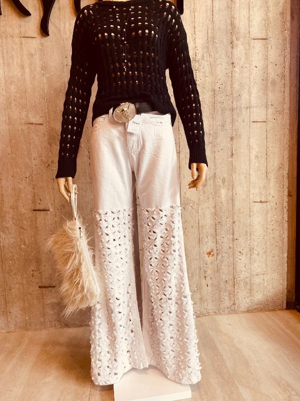 Jean blanco rígido con rotura en forma de flores desde rodilla a tobillo.